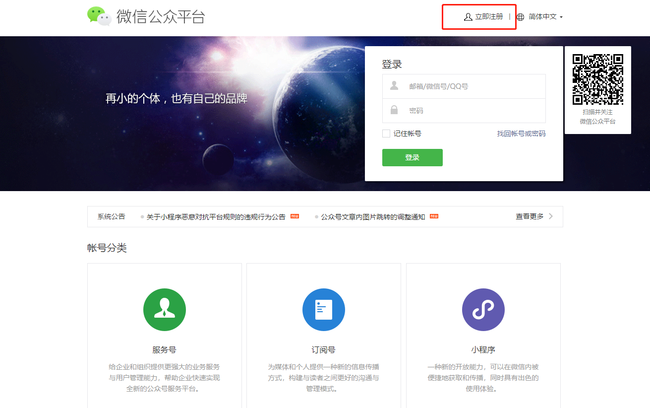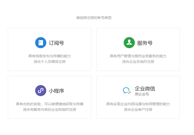 了解訂閱號、服務(wù)號和企業(yè)微信的區(qū)別后,選擇想要的帳號類型;