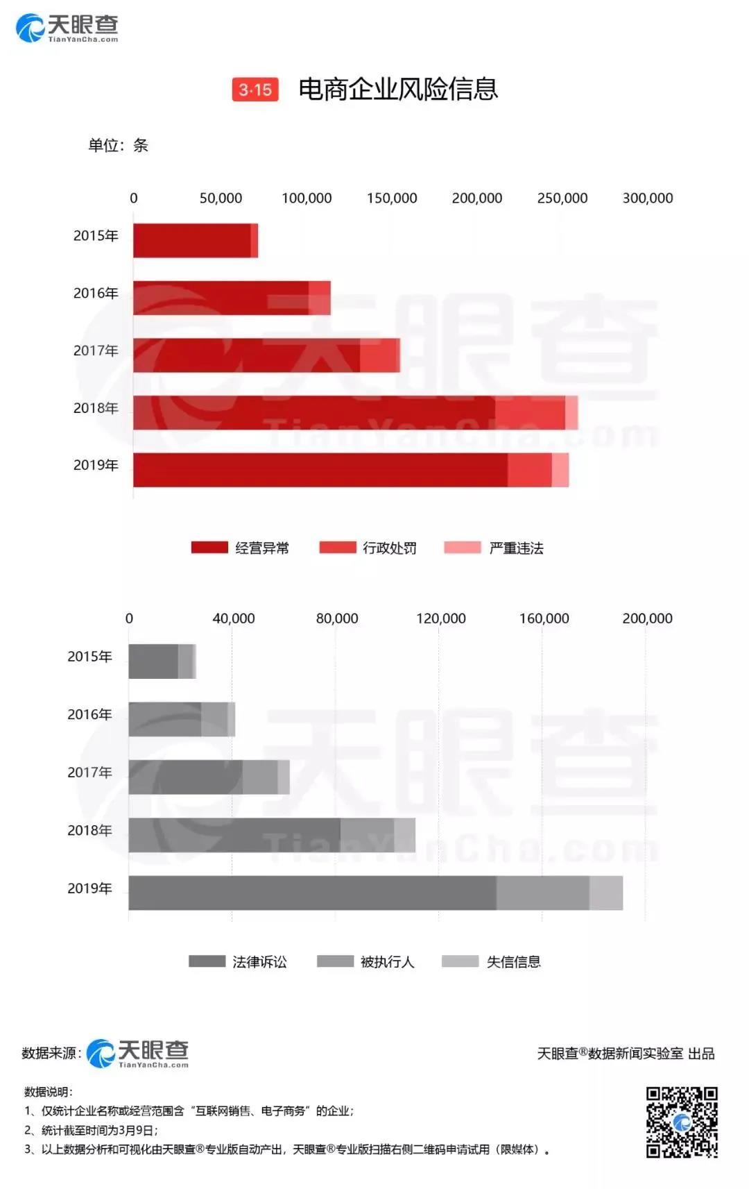 從司法風險來看,法律訴訟案件數(shù)量持續(xù)上漲,僅2019年就達14萬件。此外,電商企業(yè)近5年共產(chǎn)生8.6萬條被執(zhí)行人信息和超3萬條失信信息。