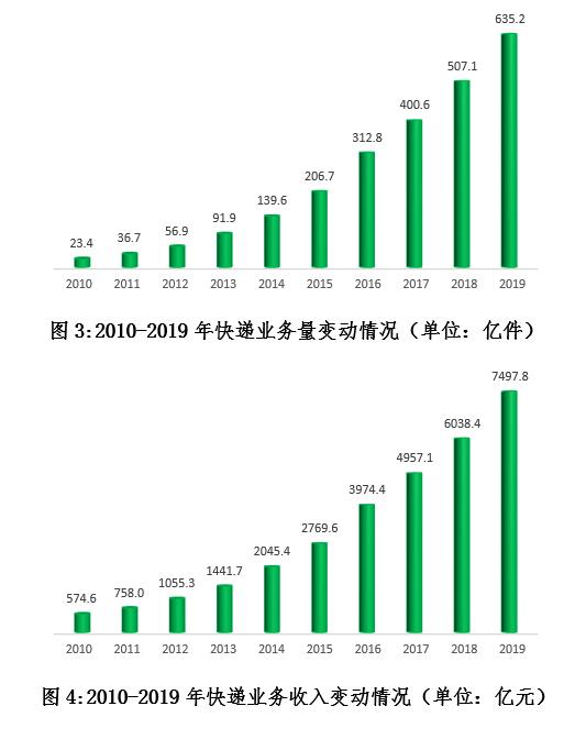 市場規(guī)模中高速增長。2019年,全國快遞企業(yè)日均快件處理量超1.7億件,同比增長25.3%,最高日處理量達5.4億件,同比增長28.5%。全國快遞業(yè)務量突破600億件,累計完成635.2億件,同比增長25.3%,增量規(guī)模連續(xù)兩年超過100億件。快遞業(yè)務收入累計完成7497.8億元,同比增長24.2%,量收增速差從去年的4.8%進一步縮小為1.1%,行業(yè)逐漸由規(guī)模單向驅動向規(guī)模效益雙向驅動轉變。與2010年相比,快遞業(yè)務量收分別增長了26.1倍和12.0倍,業(yè)務收入年均復合增長率是同期國內生產總值增速的4倍,成為拉動經濟增長的重要動力。