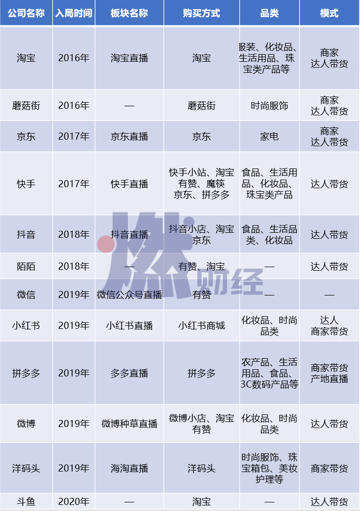 從這份名單可以看出,早期入局的公司多為電商平臺(tái),包括淘寶、蘑菇街、京東等,隨后擴(kuò)展至快手、抖音等短視頻平臺(tái),2019年以來入局的公司類型更為廣泛,包括微信、微博、小紅書、斗魚等社交、直播等平臺(tái),近日,百度也被曝出即將上線電商直播。