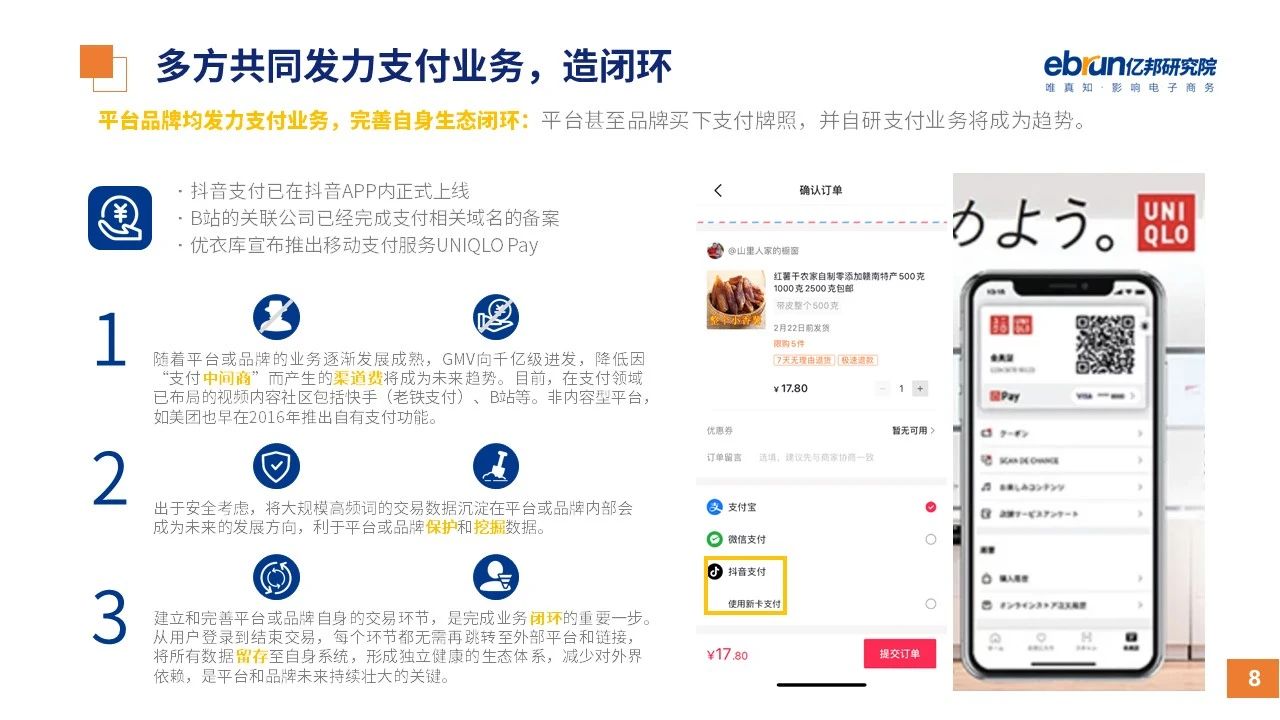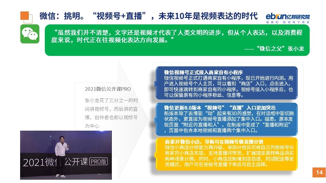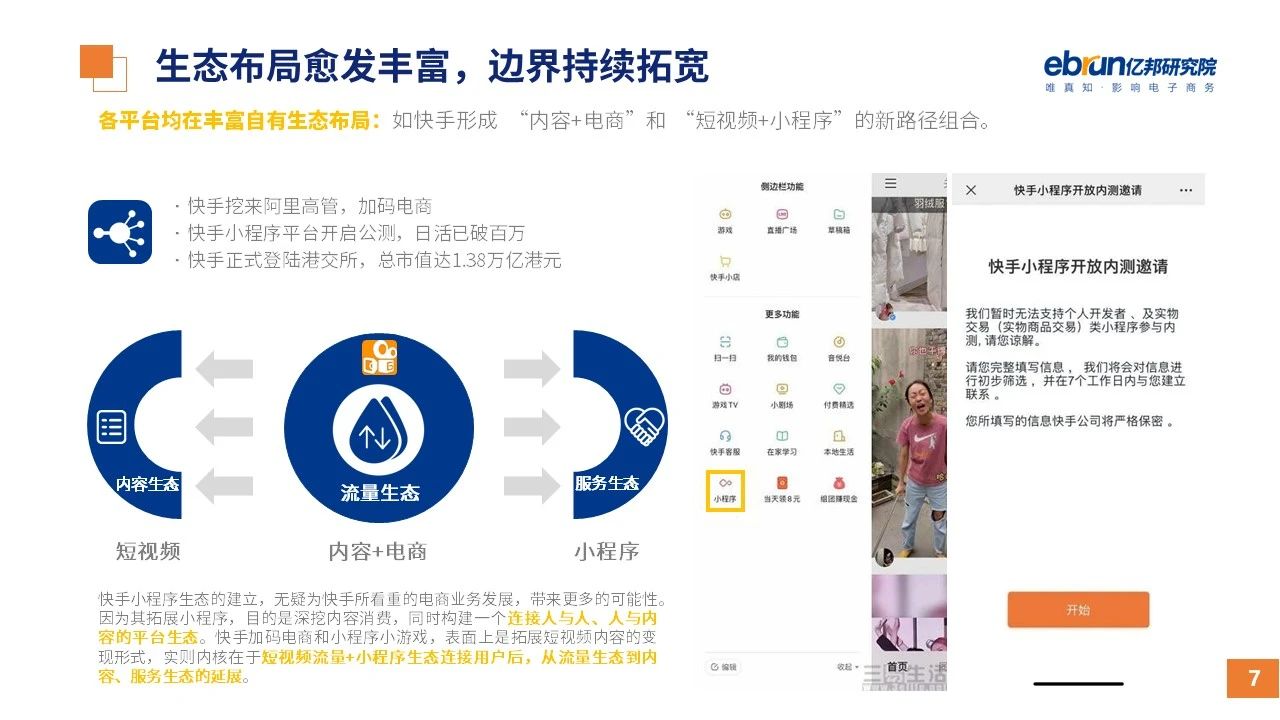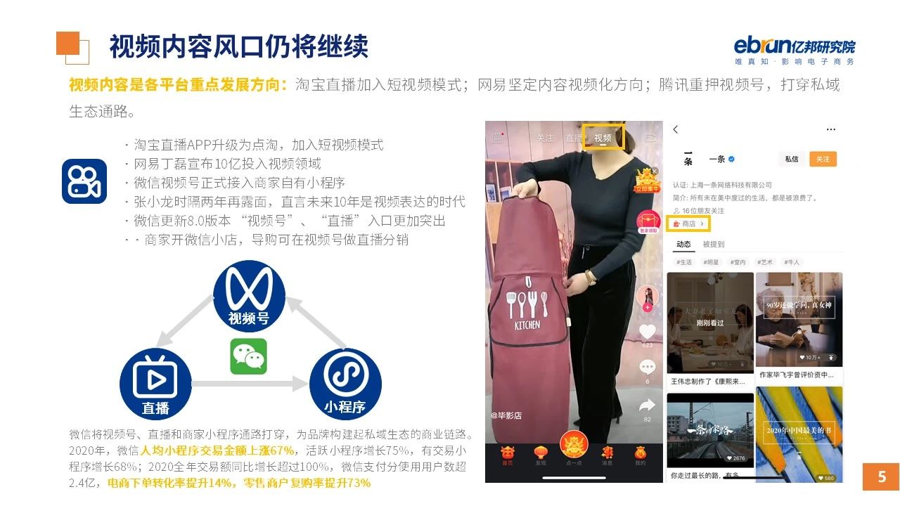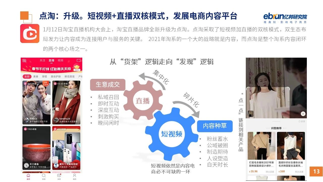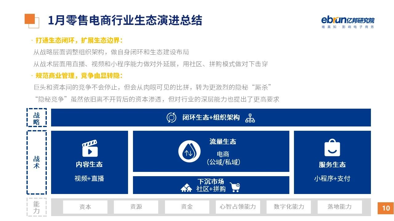縱觀2021年1月,各平臺(tái)豐富自有生態(tài)布局,如淘寶直播(點(diǎn)淘)加入短視頻模式、騰訊重押視頻號(hào)、快手加碼電商和小程序、抖音推出支付等;視頻內(nèi)容成為各平臺(tái)未來(lái)重點(diǎn)發(fā)力方向;“九不得”新規(guī)發(fā)布后社區(qū)團(tuán)購(gòu)仍熱情不減;國(guó)家和市場(chǎng)對(duì)互聯(lián)網(wǎng)巨頭和電商相關(guān)消費(fèi)加大監(jiān)管力度……你信和不信,你知道和不知道的,都在這份億邦動(dòng)力研究院正式發(fā)布的